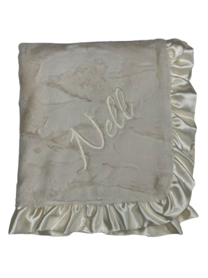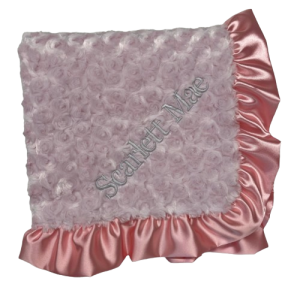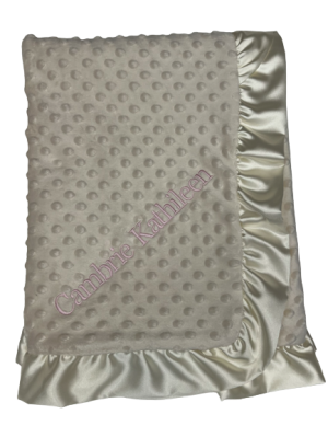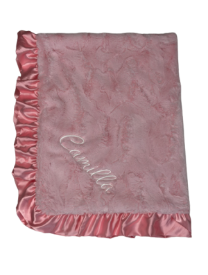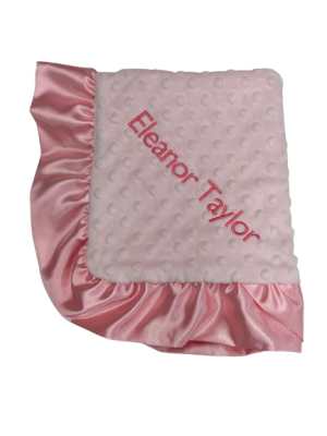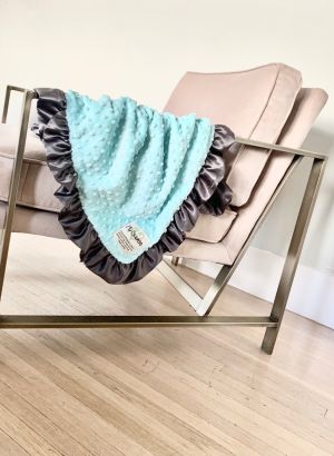 Handcrafted in Los Angeles from premium ultra-soft fabrics including minky dot with raised embossed texture and luxurious satin borders. Available in flat satin or ruffle satin trim. Perfect for swaddling, stroller rides, and creating lasting memories.